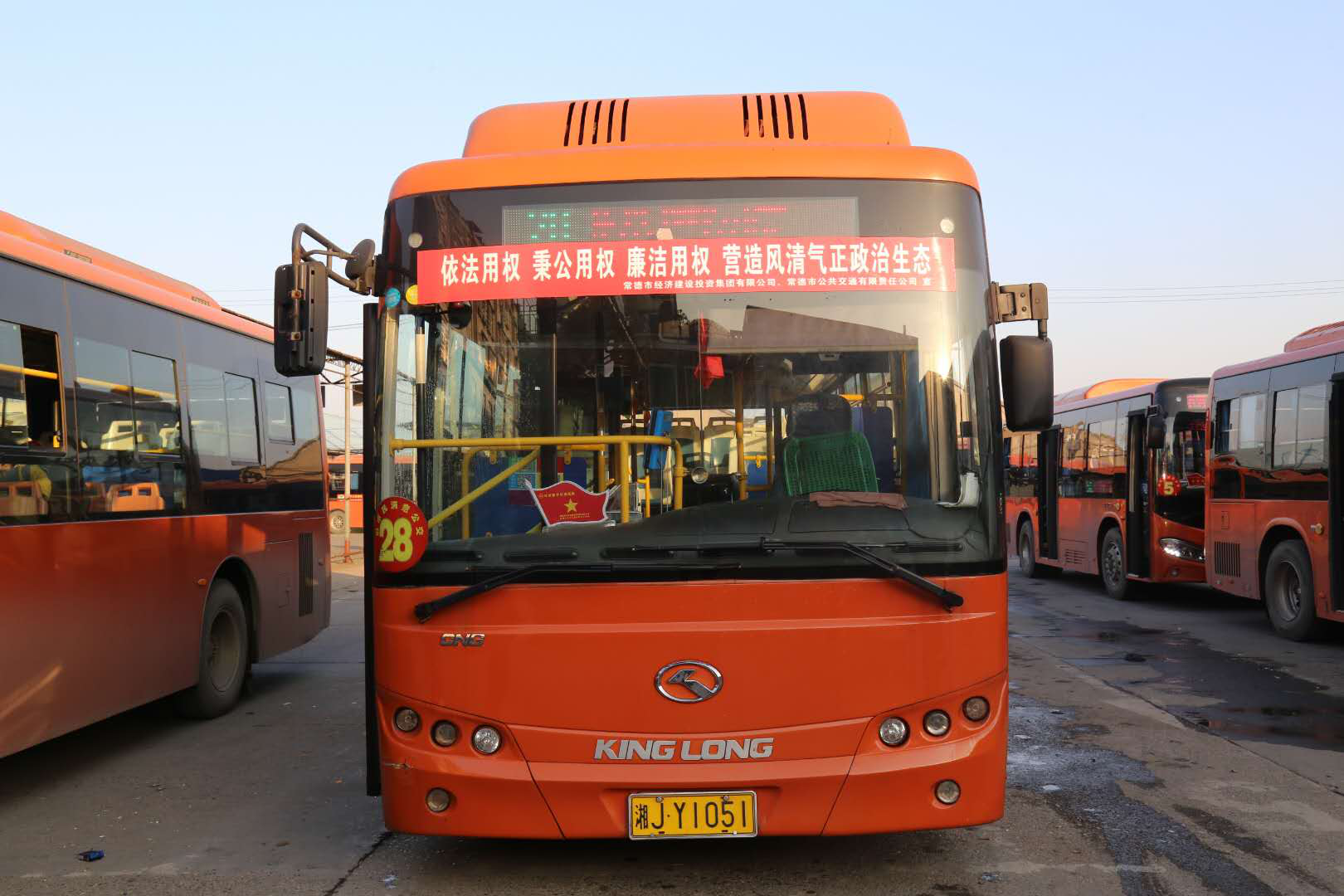 图为28路公交路线车前档玻璃板粘贴正式发布廉洁技术 口号