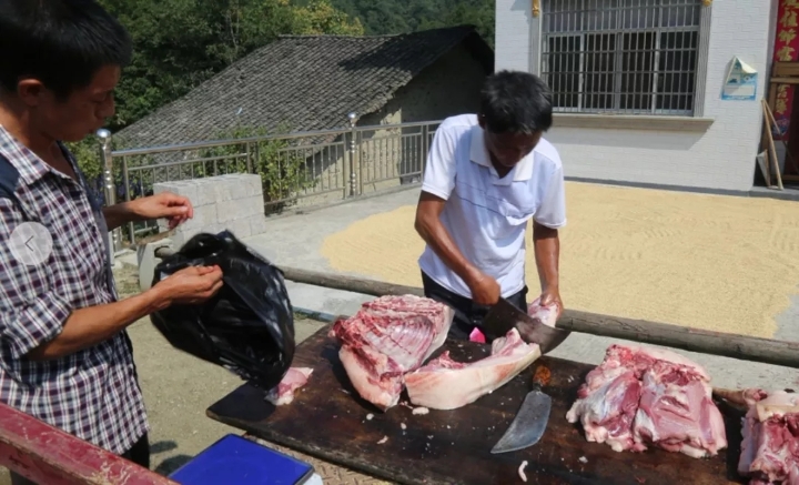图为竹儿岭社群农户家在切割土新鲜猪肉