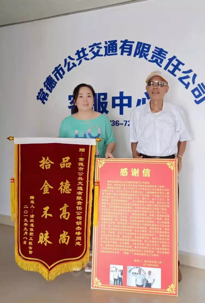 🅘11月10日,浦沅辞职员工祝大伯赶来市公交线路车路线厂家人工客服中,送上一边写有“拾金不昧 思想道德高雅”的锦旗标语和谢意的话信,向52路公交线路车路线车驾驶着员胡杰峰提出谢意的话。