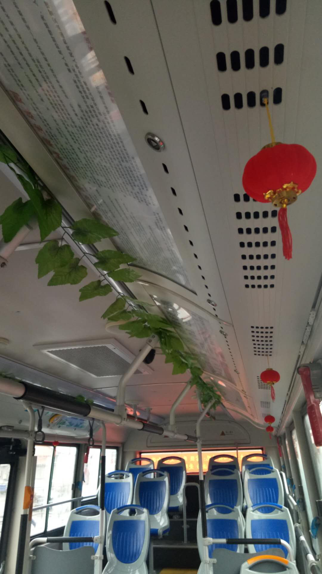 图为一分公司38路线车厢内添置的小红灯笼及绿色挂饰