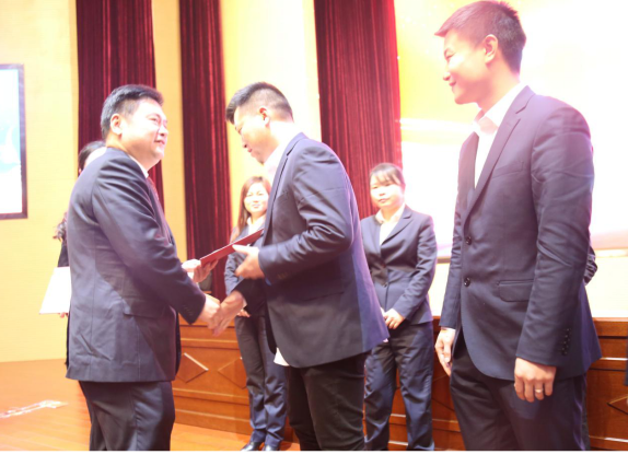 图为公司总经理胡安平(左前)正在为优秀个人颁奖