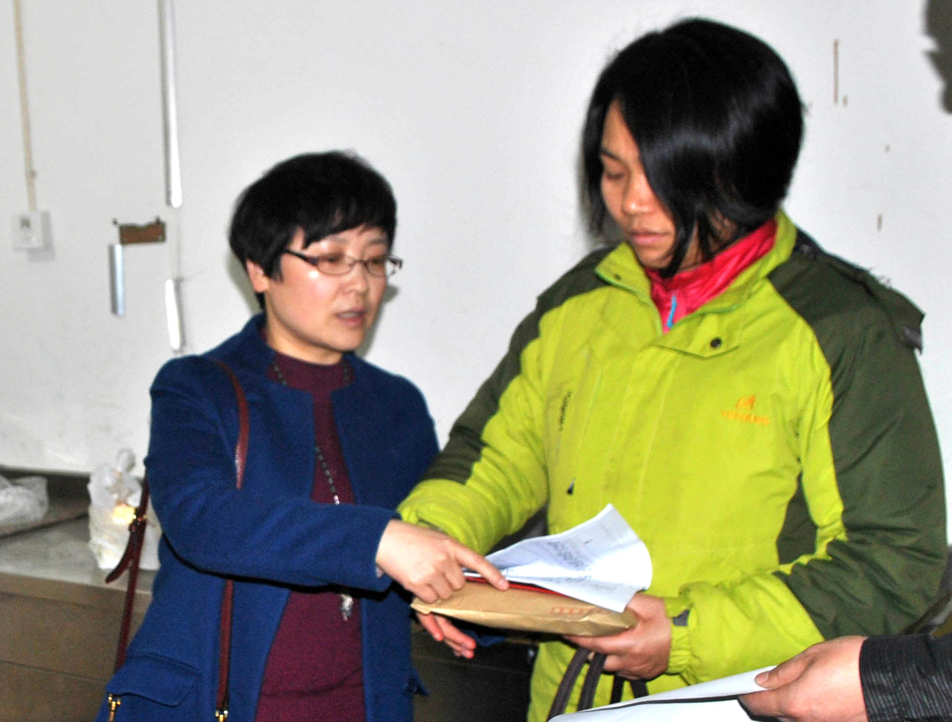 图为子公司商会领导皮建宏(左)正将愛心款拿走邓希岗子女