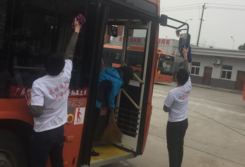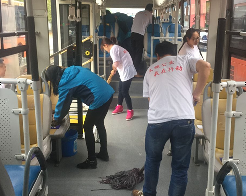 图为青年团中国志愿者者也在对公转账交车车体参与清洁卫生